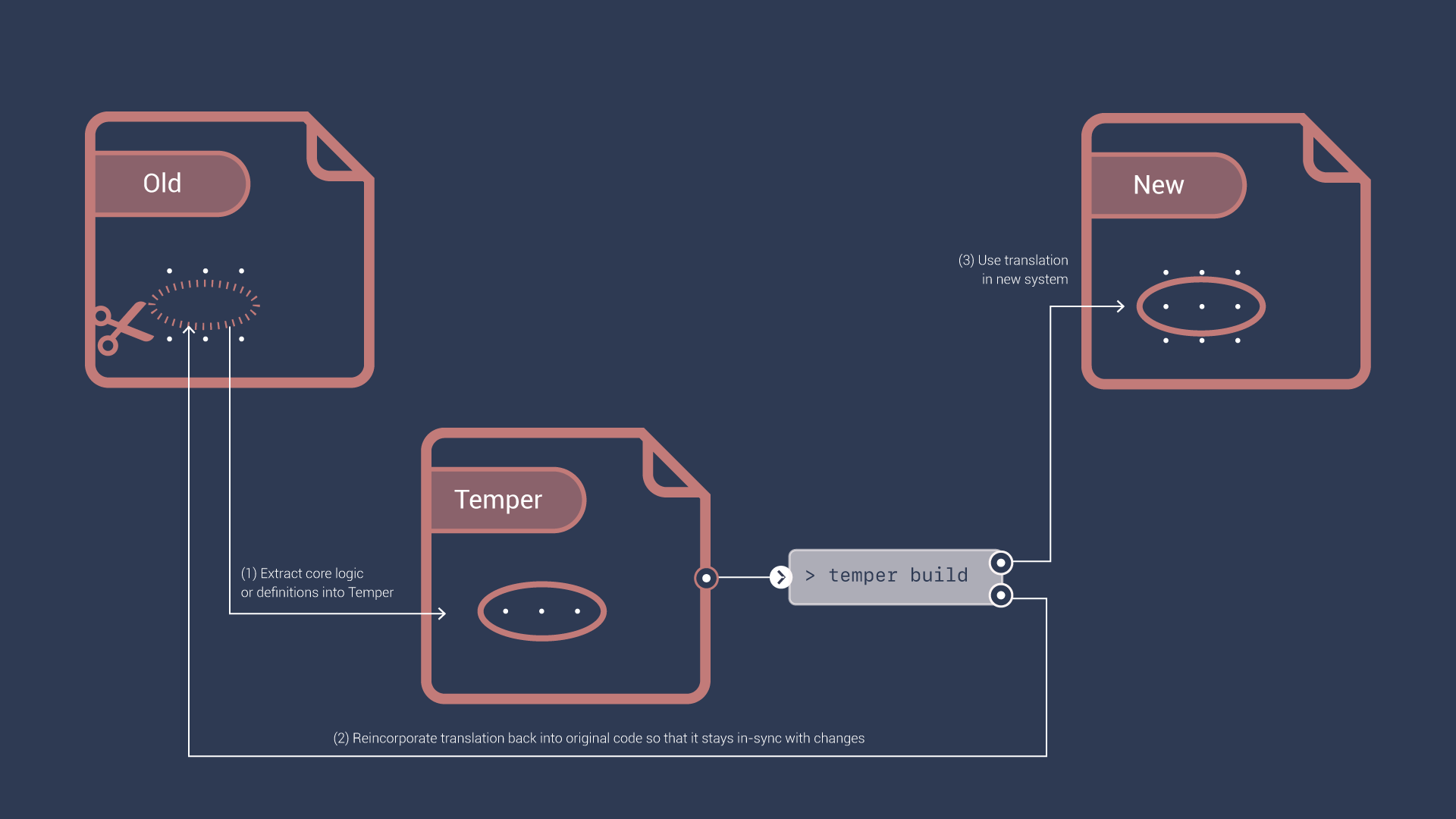Migrating old or acquired code is easier if you can extract key definitions and business logic into Temper, and actively maintain it while using it, via translation, in both the old and new systems.